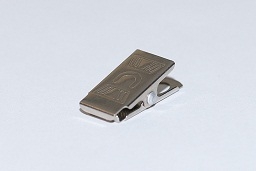 Description: Nickel-plated steel shank embossed "U" bulldog clip with overlapping jaw