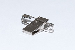 Nickel-plated steel shank embossed "U" bulldog clip with overlapping jaw and safety pin
